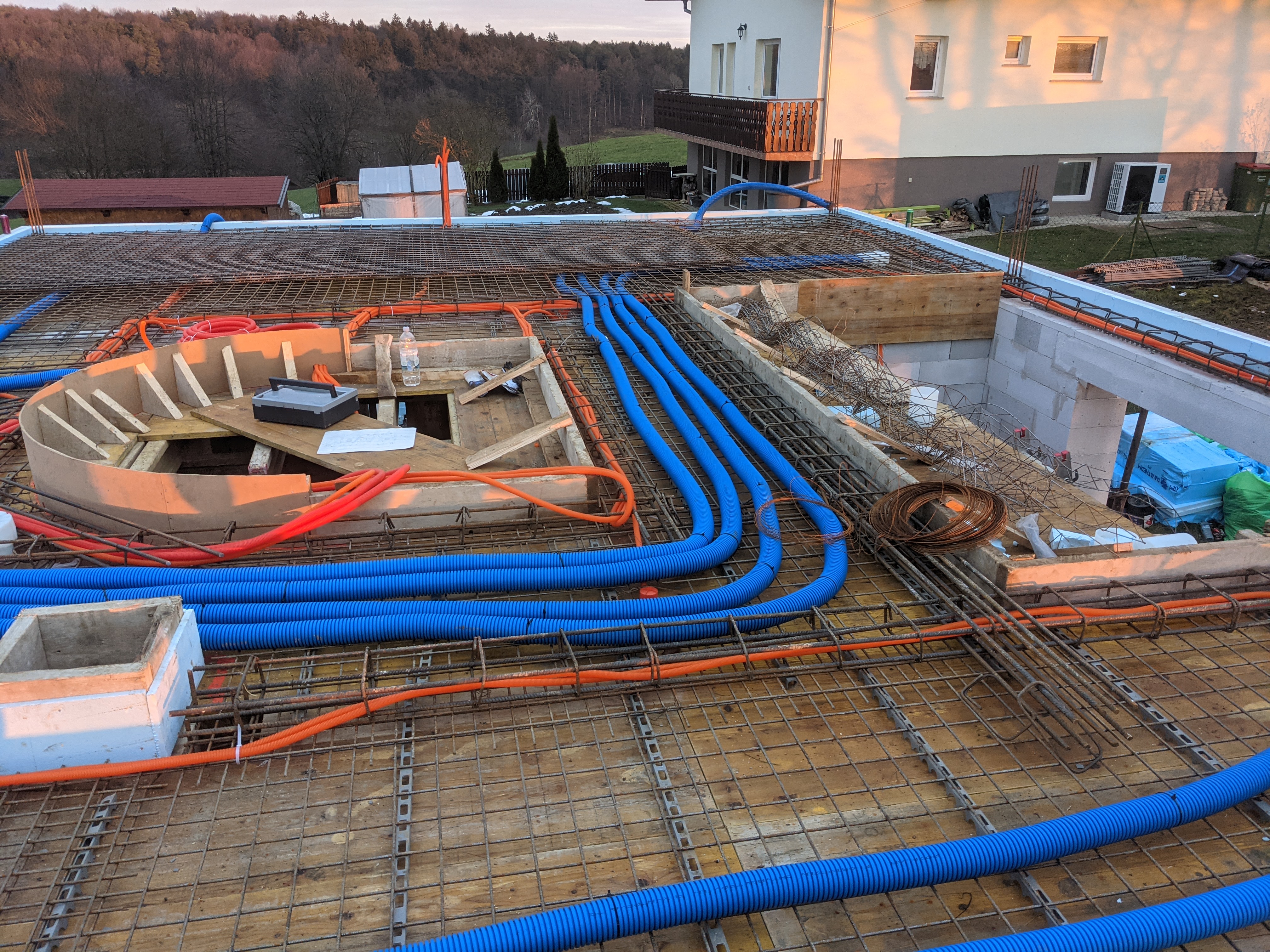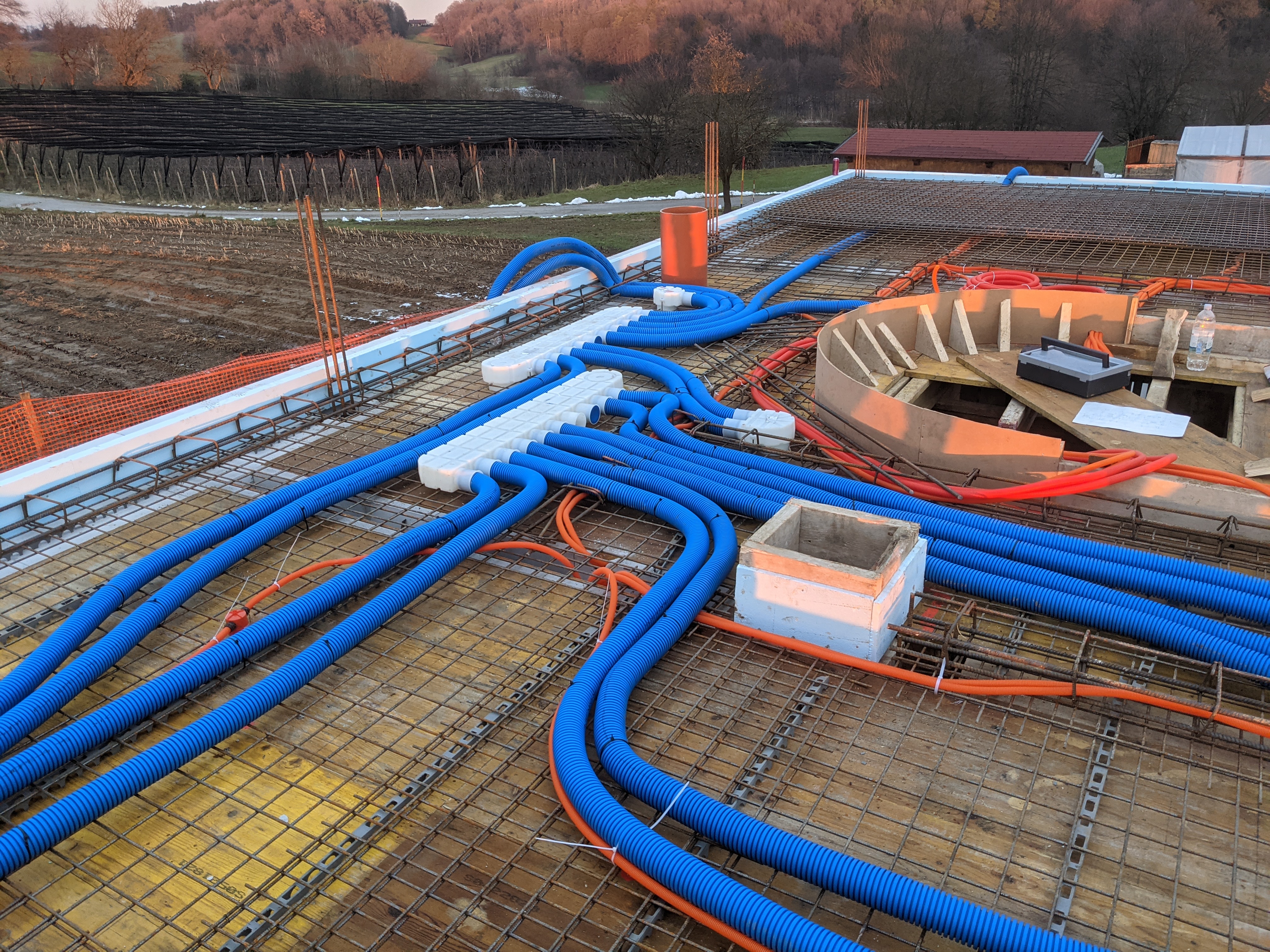 Ker spuščanje stropa ni bilo optimalno, smo prezračevalne cevi speljali po betonski plošči in vanjo umestili tudi razdelilec ter difuzorje.
